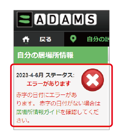ADAMSにて[ステータス:エラーがあります]が表示されます。また、カレンダー上で、エラー日が赤い文字で表示されます。エラー内容を確認し、更新が必要です。